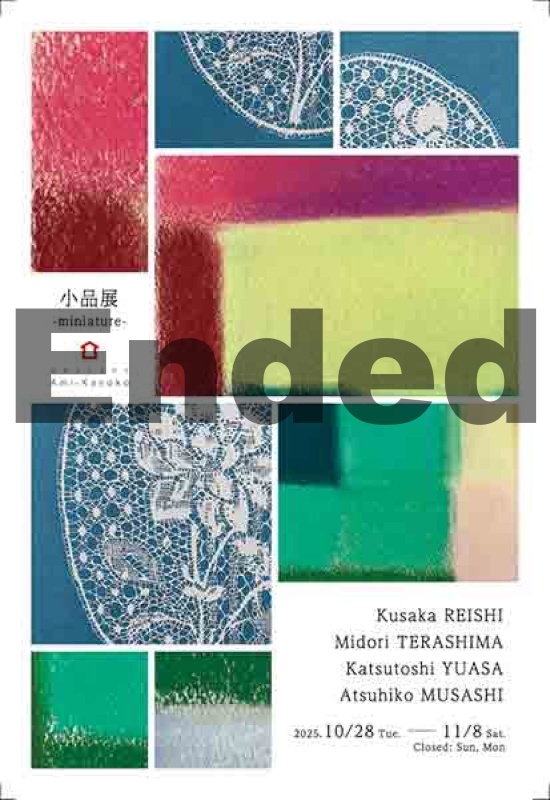 CURRENT EXHIBITION 3F Trace of Afterimage 残像 ゆらぎの定着 2025.10.28 – 2025.12.14 (終了しています) 2F 小品展 2025.10.28 – 2025.12.14 (終了しています) NEXT EXHIBITION 3F INSPIRATION-イメージの始まり 2025.12.15 – 2025.12.20 (展覧) 2F INSPIRATION-イメージの始まり 2025.12.15 – 2025.12.20 (展覧) FacebookXHatenaPocketCopy