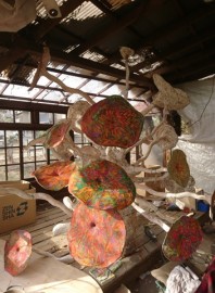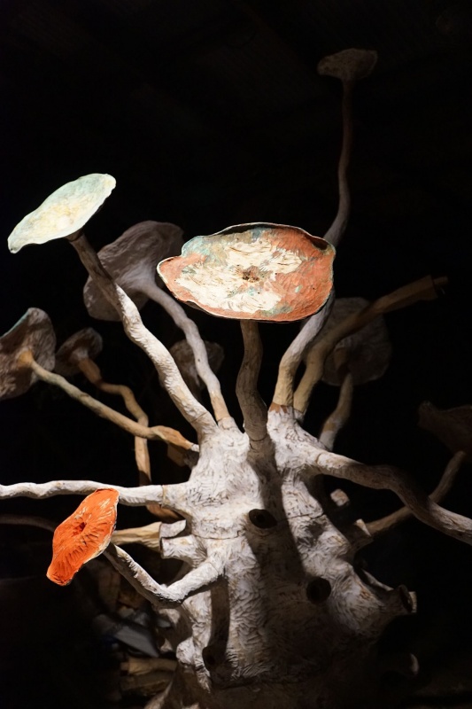 今回メインとなる作品では、『絵画の庭-千蛇花Ⅱ』というタイトルです。Ⅱとあるように、2010年に制作した同様のタイプの作品を、久しぶりに制作したものです。前作同様、中心部から30本の首状のものが伸び、それぞれの先が花開き、色彩が繰り広げられています。色彩は実際に見えている開いた部分だけでなく、中央の内部にも、そして首の内側もすべて描かれています。つまり、すべての色彩の表面はひとつながりとなっています。実際には不可能ですが、もし広げてみれば、1枚の色の付いた表面=絵画表面となるのです。(ただし今回は、30の穴が開いていることにはなりますが)